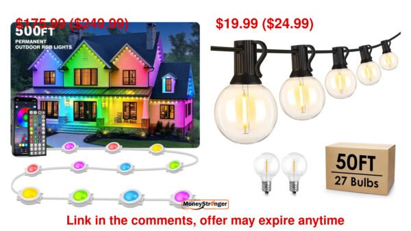 in Amazon LITSOUL 500FT Permanent Outdoor Lights for House Waterproof $175.99 ($249.99), Mlambert 50Ft LED Outdoor String Lights $19.99 ($24.99) #ad